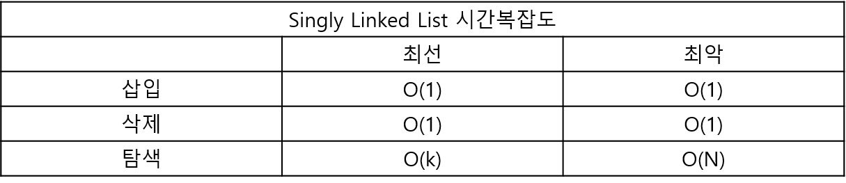 따라서 배열처럼 동시에 인덱스를 통한 Random Access는 불가능하고, 처음부터 원하는 데이터가 나올 때까지 탐색을 진행해야 하기 때문에 O(N)의 시간 복잡도가 요구된다는 단점이 있음